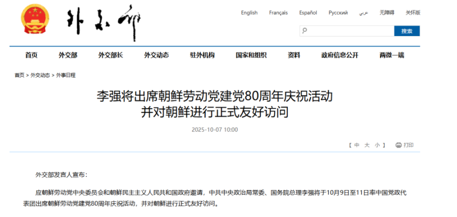 应朝鲜劳动党中央委员会和朝鲜民主主义人民共和国政府邀请,中共中央政治局常委、国务院总理李强将于10月9日至11日率中国党政代表团出席朝鲜劳动党建党80周年庆祝活动,并对朝鲜进行正式友好访问。