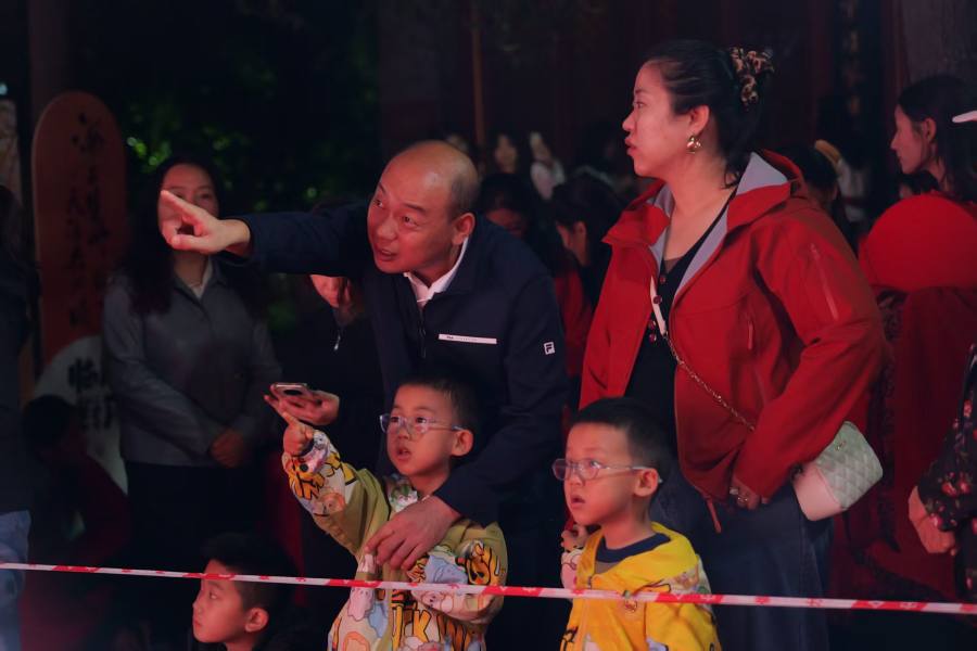 城隍庙内,古韵与温情缭绕。秋夜温柔的月光里,庙内朝月设席,福果齐陈,典雅庄重。戏楼处,古筝声响起,悠扬流淌,琴音绕梁。飞檐斗拱间,只见众人着汉服整齐肃立,按“迎月、奠月、拜月、宴月”四个环节开展拜月仪式。赞礼官率众“迎月”升空;继而“奠月”,以福果、美酒敬奉;而后,众人随赞礼官“拜月”,行三拜之礼,祈家国安康;至“宴月”环节,人们共同分享起由福果与月饼分切而成的“福胙”,个个喜笑颜开,这份寓意美好的节令佳品,让文化韵味与人间暖意在此刻圆满交织。这一晚,市民们在熟悉的文化空间感受到了传统节日的厚重底蕴,也让传统文化于城市文化地标焕发蓬勃生机。