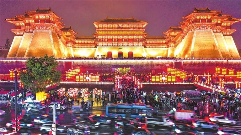 10月5日晚,洛阳市隋唐洛阳城国家遗址公园华灯璀璨,门前车水马龙,一派热闹繁荣之景。