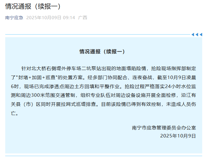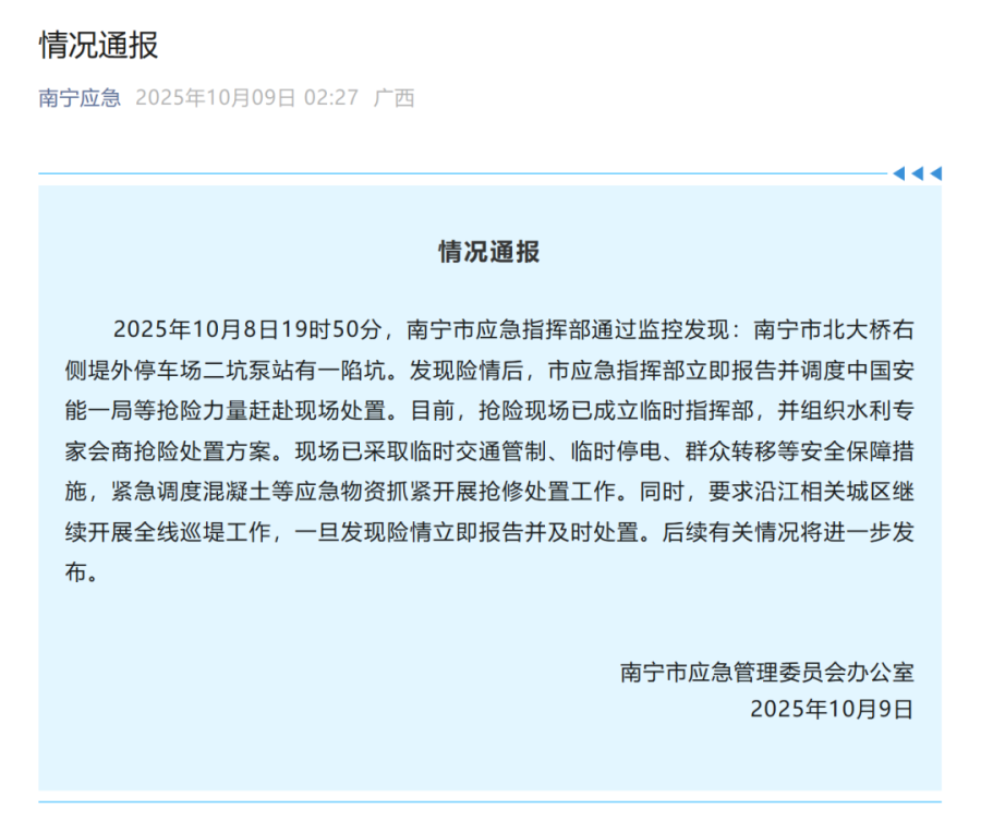 2025年10月8日19时50分,南宁市应急指挥部通过监控发现:南宁市北大桥右侧堤外停车场二坑泵站有一陷坑。发现险情后,市应急指挥部立即报告并调度中国安能一局等抢险力量赶赴现场处置。目前,抢险现场已成立临时指挥部,并组织水利专家会商抢险处置方案。现场已采取临时交通管制、临时停电、群众转移等安全保障措施,紧急调度混凝土等应急物资抓紧开展抢修处置工作。同时,要求沿江相关城区继续开展全线巡堤工作,一旦发现险情立即报告并及时处置。后续有关情况将进一步发布。