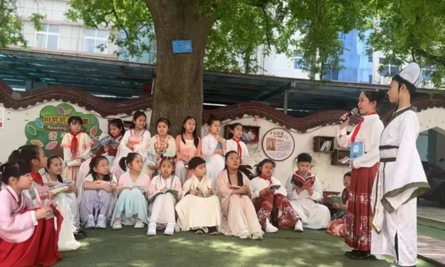 除了读书分享,大树下的空间还是学生们展示自我的舞台。“每年的5月,我们学校都会举办艺术节,皂荚树下就是学生们展示才艺的地方,尤其是下午上课前,这里可热闹了”,杨帆一边说一边给我们看她手机里保存的视频。