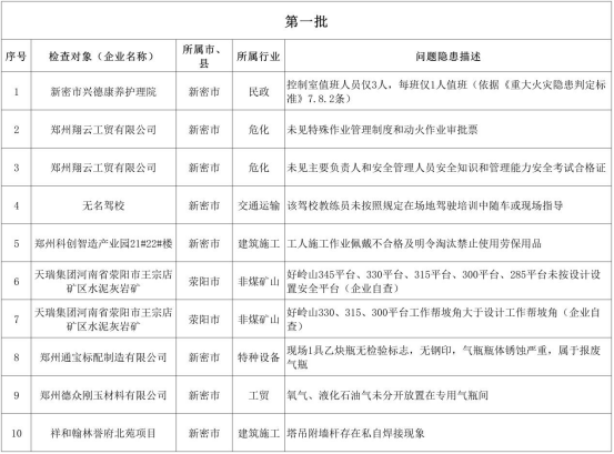 为扎实推进安全生产治本攻坚三年行动,压实企业安全生产主体责任,切实提高隐患排查整改质量,推动重大事故隐患动态清零,按照《河南省安全生产委员会关于开展全省第二轮安全生产明查暗访的通知》,2025年8月28日至9月9日,河南省安全生产明查暗访第一组对郑州市进行了明查暗访,现对明查暗访组发现的突出问题隐患予以集中曝光。各区县(市)、市直有关部门要高度重视,对问题隐患立行立改、依法查处,特别是对典型问题隐患要挂牌督办、追责问责、公开曝光、一案双罚;对问题隐患已整改到位的要持续跟进,防止问题反弹。要深入开展自查自纠,举一反三排查整治,彻底消除安全隐患,确保人民群众生命财产安全。