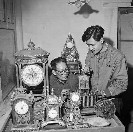 1960年2月,故宫博物院高级钟表技工马玉良和师父一起修复乾隆年苏州造的钟。 冯文冈摄