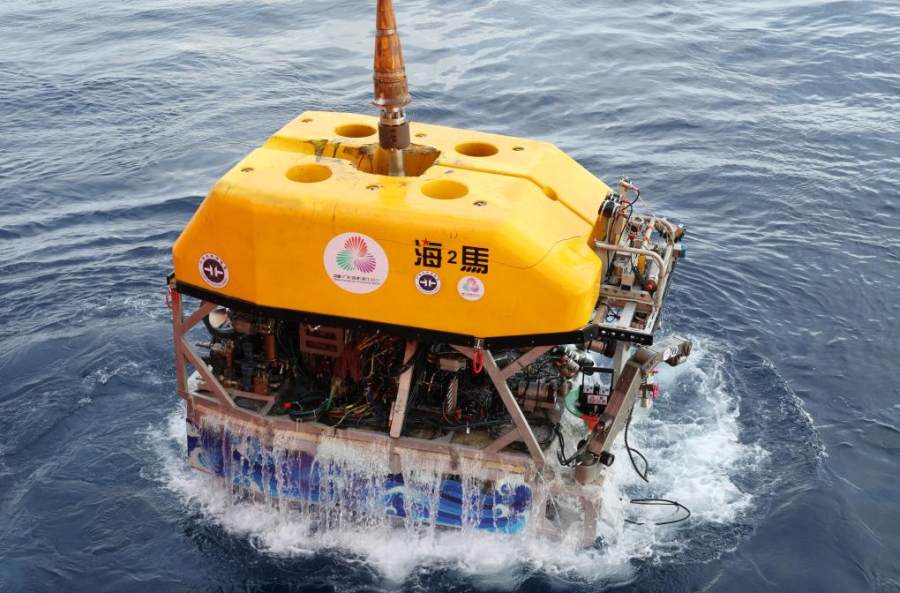 “海洋地质二号”科考船搭载“海马”号深海遥控潜水器在南海北部进行“源火”采集(9月18日摄)。 新华社记者 卢汉欣 摄