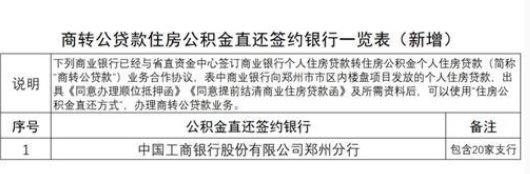 10月10日,河南省省直机关住房资金管理中心发布通知,新增中国工商银行股份有限公司郑州分行(包含20家支行)为商转公“住房公积金直还”合作签约银行。