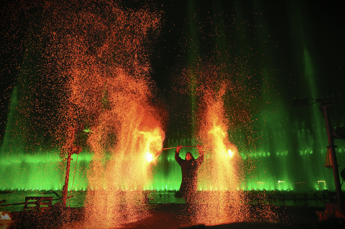 夜幕降临,整场活动的“压轴大戏”——国家级非遗“打铁花”惊艳登场,更与绿博园景区音乐喷泉精准呼应,将雨夜氛围推向顶点。随着激昂的音乐响起,喷泉水柱伴着节奏腾空而起,时而化作扇形水幕舒展,时而凝成柱状直冲夜空;与此同时,1600℃的炽热铁水在匠人手中瞬间化作万点星火腾空,与喷泉光影交织:金色铁花落在水幕上,溅起细碎光雾,似星河坠入碧波;水柱攀升时,铁花恰好绽放于顶端,宛如“火树银花映碧水”的绝美画卷。雨水让铁花的光芒更显朦胧,喷泉的律动又为这份震撼增添了灵动韵律,观众纷纷举起手机拍摄,惊叹声、欢呼声与铁花溅落的“滋滋”声、喷泉的“哗哗”声、音乐的旋律交织在一起。