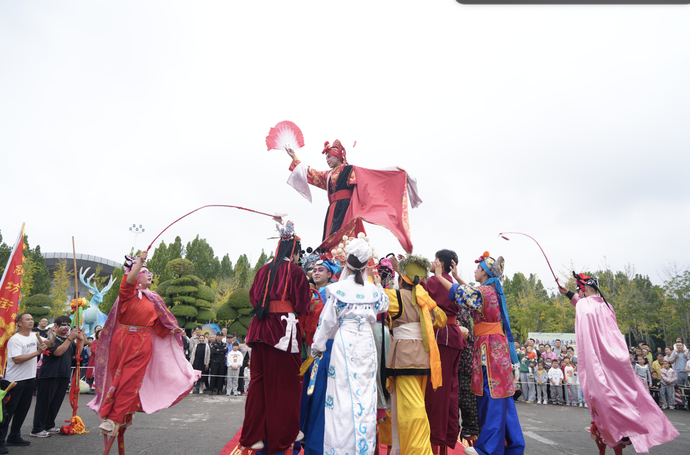 参加展演的均为国家级、省级非遗项目,曾荣获山花奖、金鼎奖等奖项。日间与夜间的非遗展演各有亮点,其中纸坊街高跷不仅有定点精彩表演,更创新增设园区巡游环节,成为全场流动的焦点。途中还穿插“鹞子翻身”“单腿跳凳”等精湛技法——高跷上的演员时而舒展双臂模拟飞鸟展翅,时而单脚立于高跷上旋转,衣袂在雨中翻飞,每一个动作都精准把控平衡,将高跷艺术的“险”与“美”展现得淋漓尽致。巡游所到之处,游客纷纷驻足跟随,举起手机记录精彩瞬间,雨中的欢呼声与掌声此起彼伏。