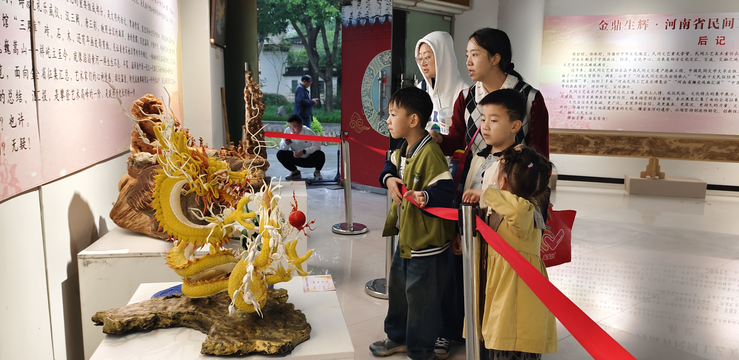 活动期间,“金鼎生辉·河南省民间工艺美术精品展”集中呈现了全省各地的工艺美术佳作。参展作品涵盖剪纸、泥塑、木雕、刺绣等多个品类,每件作品都凝聚着匠人匠心——细腻的剪纸纹路勾勒出民俗百态,栩栩如生的泥塑形象传递出生活趣味,精雕细琢的木雕作品尽显工艺巧思。其中包含不少追求创造性转化、创新性发展的精品。观众驻足展台前,不时发出“太精美了”“没想到传统工艺能这么惊艳”的赞叹,不少人拿出手机记录作品细节,沉浸式感受河南民间工艺美术的深厚底蕴与艺术魅力。