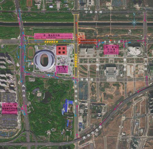 设在郑州CCD PARK(汇智路、创文路)两处地下停车场,约可停放小型车500台。观众车辆经丹水大道与雪松南路交叉口向西分别驶入汇智路、创文路两处停车场入口,进入地下停车场停放;退场时,车辆驶出停车场出口后,经丹水大道向东驶离活动现场。