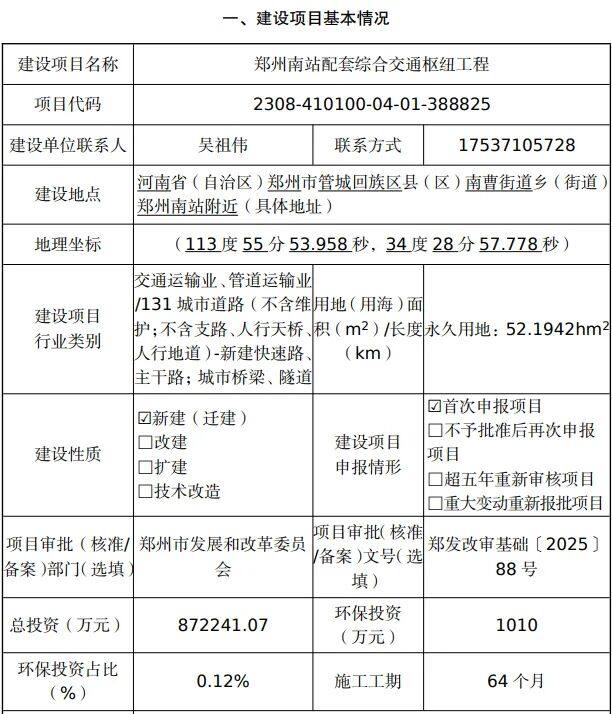 10月10日,郑州市生态环境局管城分局受理了郑州南站配套综合交通枢纽工程建设项目(告知承诺制)环境影响评价文件。公示期为2025年10月10日—2025年10月15日(5个工作日)。