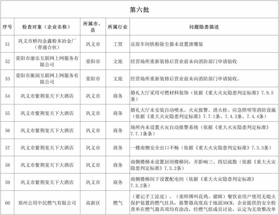 为扎实推进安全生产治本攻坚三年行动,压实企业安全生产主体责任,切实提高隐患排查整改质量,推动重大事故隐患动态清零,按照《河南省安全生产委员会关于开展全省第二轮安全生产明查暗访的通知》,2025年8月28日至9月9日,河南省安全生产明查暗访第一组对郑州市进行了明查暗访,现对明查暗访组发现的突出问题隐患予以集中曝光。各区县(市)、市直有关部门要高度重视,对问题隐患立行立改、依法查处,特别是对典型问题隐患要挂牌督办、追责问责、公开曝光、一案双罚;对问题隐患已整改到位的要持续跟进,防止问题反弹。要深入开展自查自纠,举一反三排查整治,彻底消除安全隐患,确保人民群众生命财产安全。