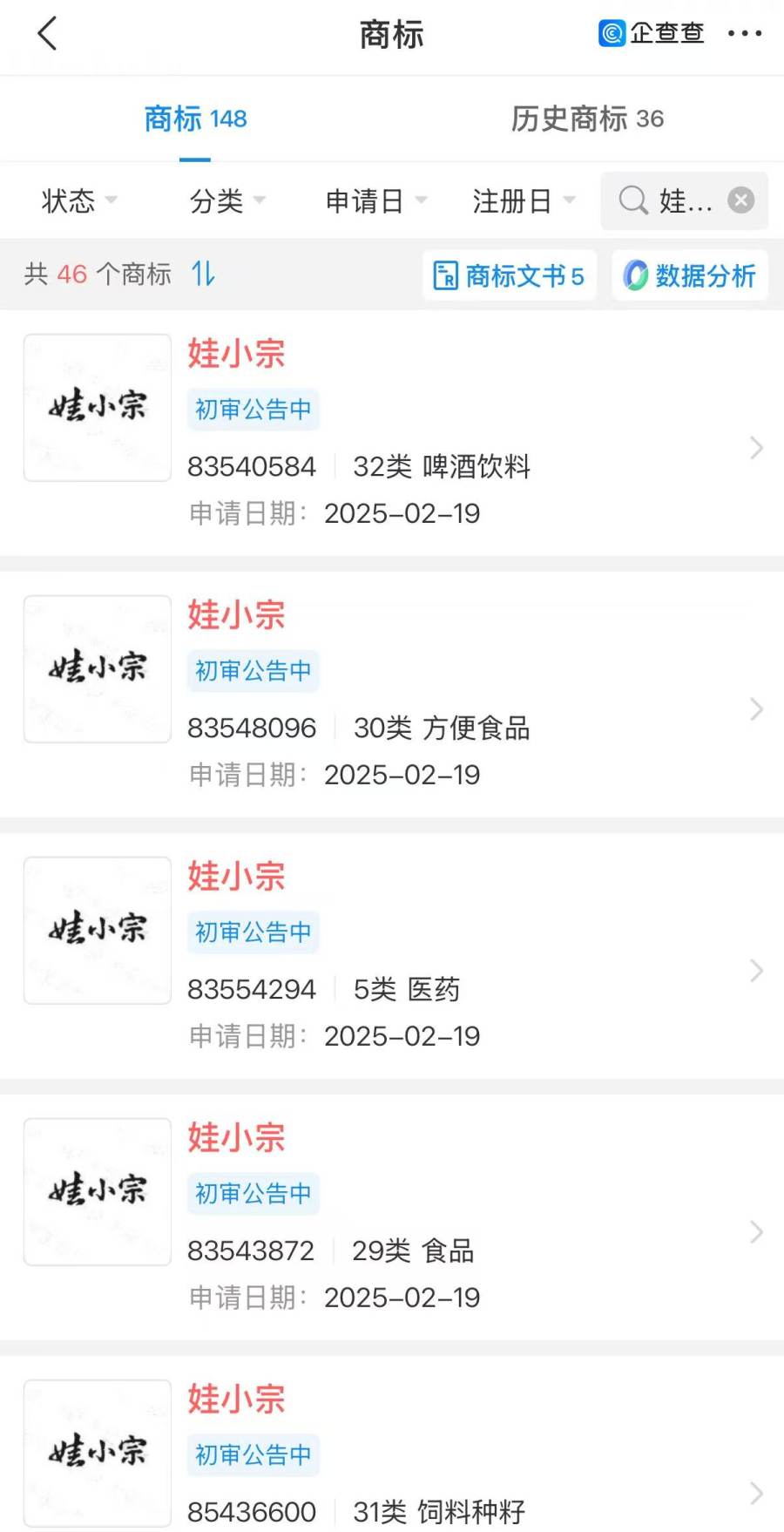 据企查查显示,自今年2月以来,宏胜饮料集团有限公司申请多枚“娃小宗”等商标,产品矩阵将聚焦”新国潮健康饮品”定位,涵盖低糖气泡水、益生菌饮料、方便食品等全品类。目前,该商标已进入初审。