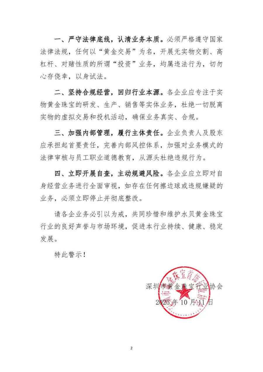 为维护行业健康秩序,防范法律风险,深圳市黄金珠宝首饰行业协会特向全体会员单位及行业企业发出郑重警示: