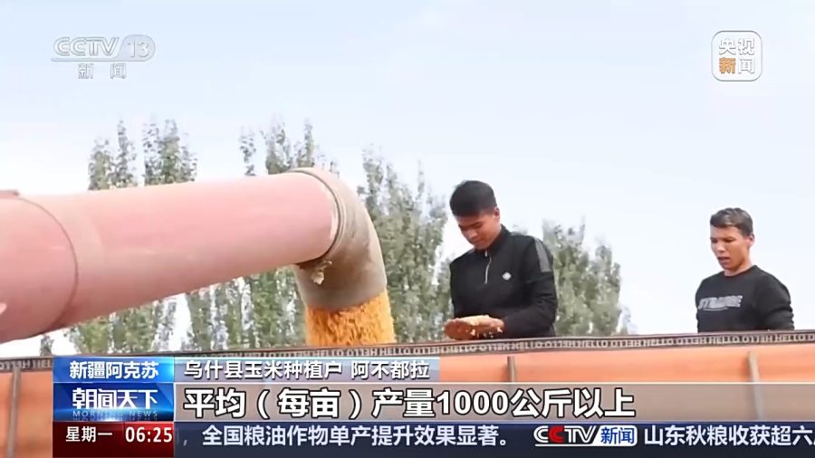 乌什县玉米种植户 阿不都拉:今年玉米长得好,我家混合种植130亩玉米,平均每亩产量1000公斤以上。