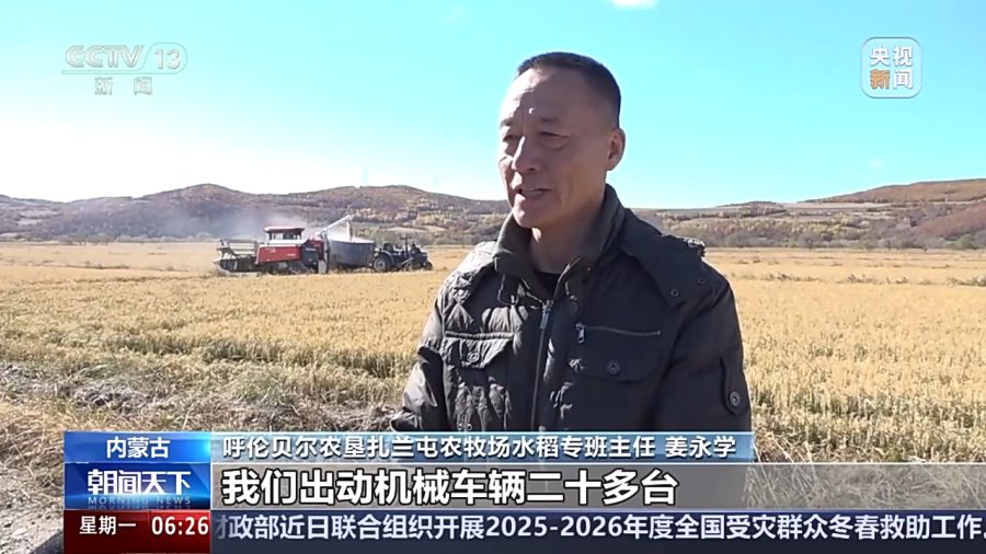 呼伦贝尔农垦扎兰屯农牧场水稻专班主任 姜永学:我们出动机械车辆二十多台,每天加班加点进行收割,亩产预计1000斤左右。