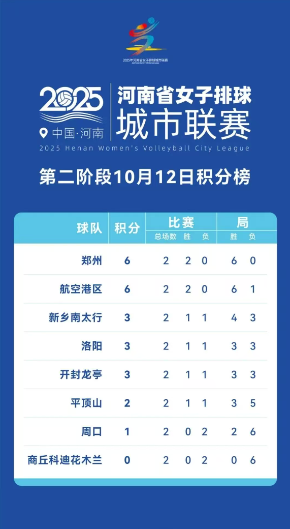 2025年河南省女子排球城市联赛第二阶段第二轮比赛12日在郑州、洛阳、周口和航空港区四地同时打响。主场作战的郑州队直落三局战胜商丘队,三局比分分别为25∶8、25∶8和25∶15。此役过后,郑州队以两战全胜、积6分且未失一局的优异战绩,稳居积分榜首位。