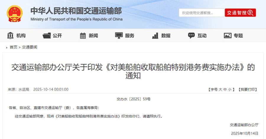 10月14日,交通运输部办公厅发布关于印发《对美船舶收取船舶特别港务费实施办法》的通知。