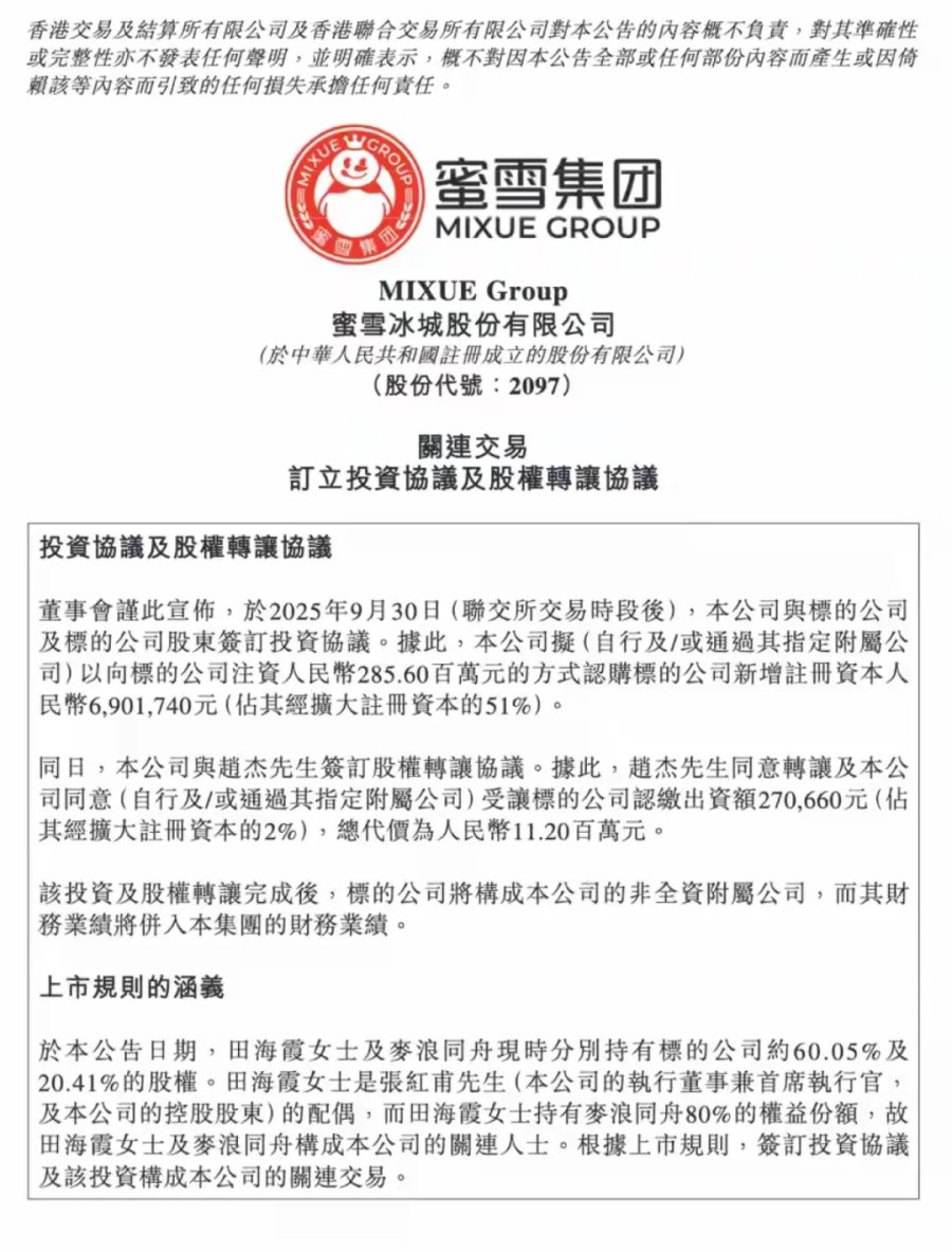 10月1日,蜜雪集团在港交所发布的公告显示,蜜雪冰城以2.856亿元增资认购鲜啤福鹿家新增注册资本,占扩大后注册资本的51%;再以1120万元从独立第三方处受让2%股权,进一步实现绝对控股。交易完成后,鲜啤福鹿家成为其非全资附属公司,财务业绩将并入集团报表。