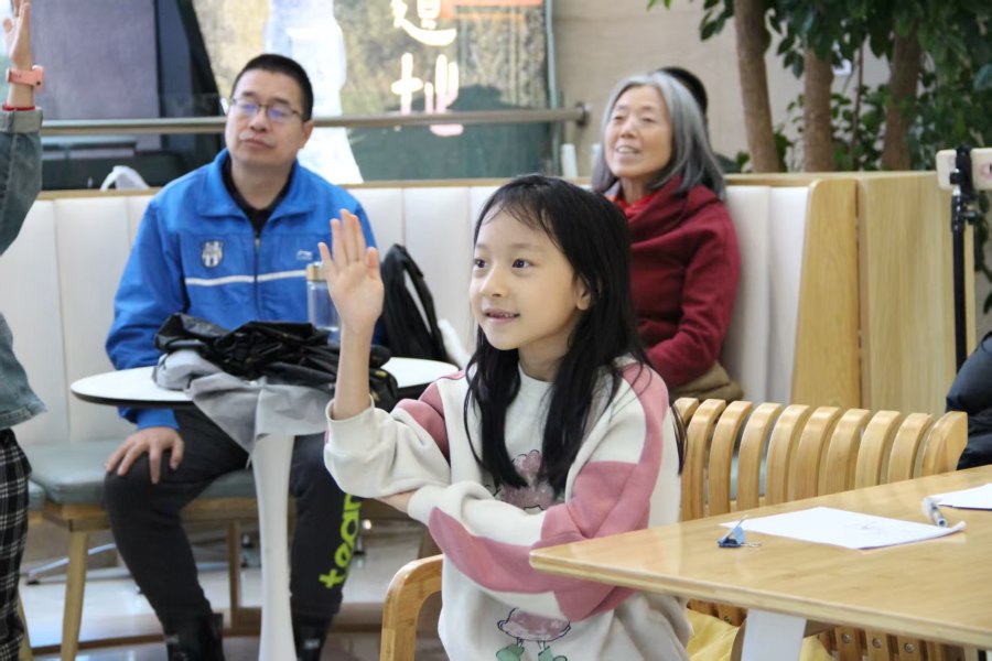 互动环节更是“重头戏”。“解字达人”游戏中,有人紧盯甲骨文字形抓耳挠腮,有人猜中后兴奋拍手;“甲骨文工坊”里,小朋友用刻刀在模拟甲骨上刻“日”“月”,大人也忍不住尝试:“原来刻字这么难,古人也太有耐心了!”“汉字寻亲”环节最热闹,大家拿现代汉字卡找甲骨“亲戚”,匹配瞬间成就感拉满。最后与苗老师对话,“怎么教孩子认甲骨文”“甲骨还能找新字吗”等问题不断,苗老师笑着解答。合影时,众人举着自己刻的甲骨文,定格这份特别的“文化纪念”。