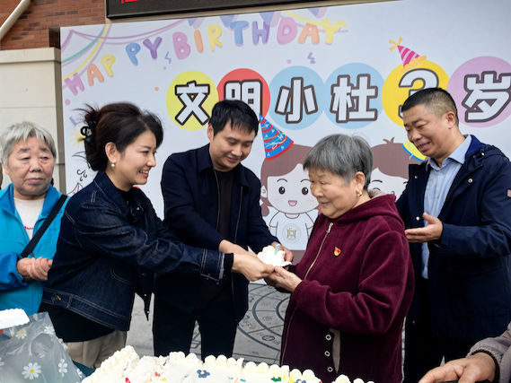 随着生日歌响起,巨型蛋糕缓缓映入眼帘,“文明小杜”微平台迎来了三周岁生日。“文明小杜”微平台于2022年10月正式上线,“做志愿、立刻办、挣积分、兑商品”,“有事好商量、分享邻里事”,小杜”像一座“暖心桥梁”,凝聚居民扎根在社区治理的各个角落,夜间巡逻、安全排查、卫生清洁、助老为老、矛盾化解......已经成为常态化志愿服务,街道愈加“向上向善向好”。