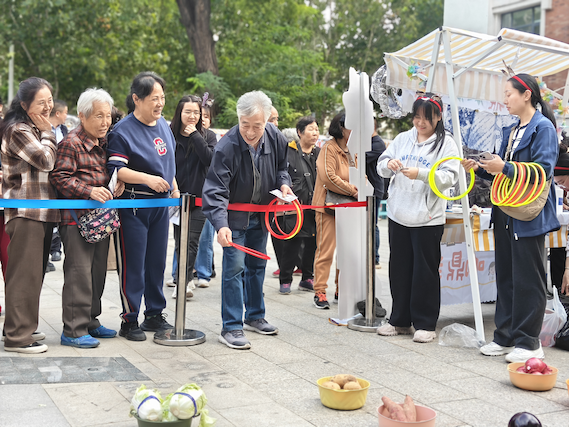 活动还开设有扎染、石膏娃娃手工体验,最火爆的当属邻里“蔬”适圈—小杜积分兑换套圈,套中土豆、苹果、生姜就能带回家,张阿姨套中两颗白菜后乐呵呵道:“这可比超市买菜还划算,又有意思!”