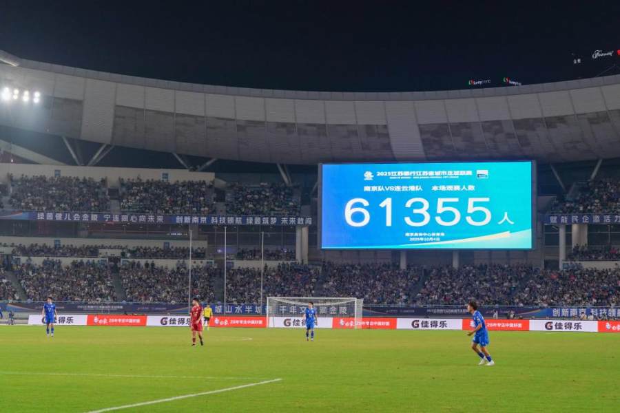 10月4日,在江苏南京举行的2025江苏省城市足球联赛(“苏超”)四分之一决赛中,南京队主场与连云港队在常规时间1比1战平,通过点球大战,南京队以5比3的总比分战胜连云港队,晋级半决赛。大屏幕显示本场比赛共有61355名球迷到场观赛。 新华社记者 李博 摄