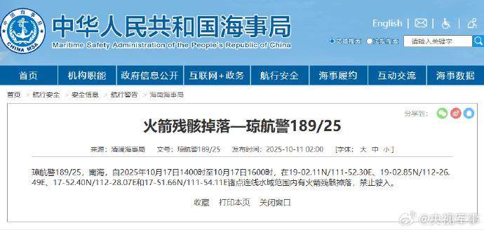 据中国海事局网站消息,清澜海事局发布航行警告,10月17日14时至16时,南海部分水域有火箭残骸掉落,禁止驶入。