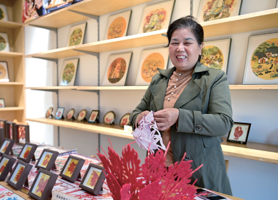 蔡家坡村口的“美好生活服务中心”里,“土生土长”的泥塑、布艺、农民画等非遗作品琳琅满目。非遗传承人杨彩霞舞动剪刀,一件栩栩如生的剪纸作品《凤冠》渐渐成形。