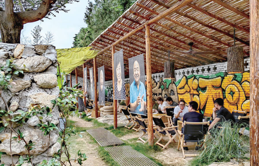 一片农家小院装饰得清新脱俗,院墙边的老槐树与楼梯相互托举,三五好友坐于其间品茗畅聊。院子中心,几名年轻女孩正摆着造型悠然自拍。店员手捧咖啡,脚步轻盈从她们身边掠过。一抬头,蓝天、白云、青山,接续入眼。