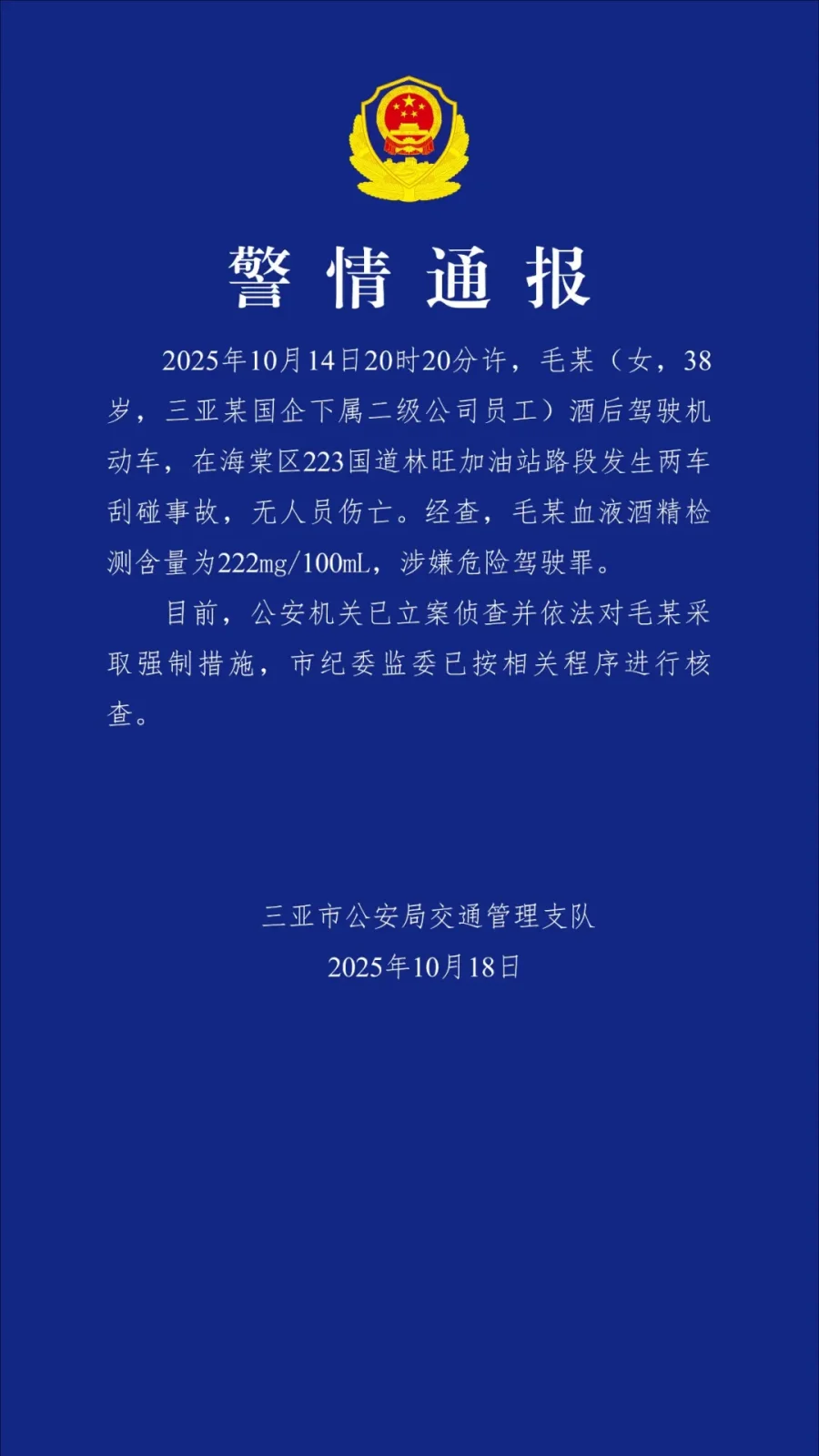 10月18日,三亚市公安局交通管理支队对外发布警情通报称,10月14日20时20分许,毛某(女,38岁,三亚某国企下属二级公司员工)酒后驾驶机动车,在海棠区223国道林旺加油站路段发生两车刮碰事故,无人员伤亡。经查,毛某血液酒精检测含量为222mg/100mL,涉嫌危险驾驶罪。