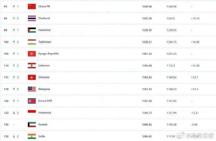 10月17日,国际足联更新了最新一期国家队排名。虽然在本月国际比赛日中没有参加任何比赛,积分未发生变化,但中国男足的排名从第94位升至第93位。