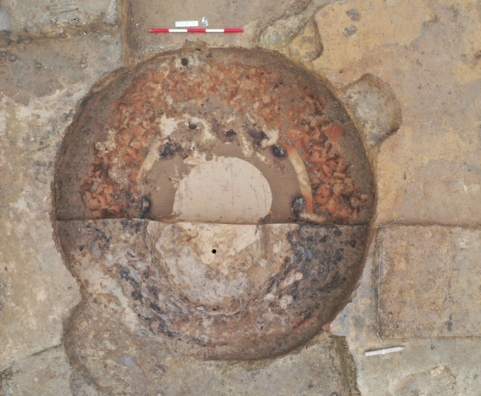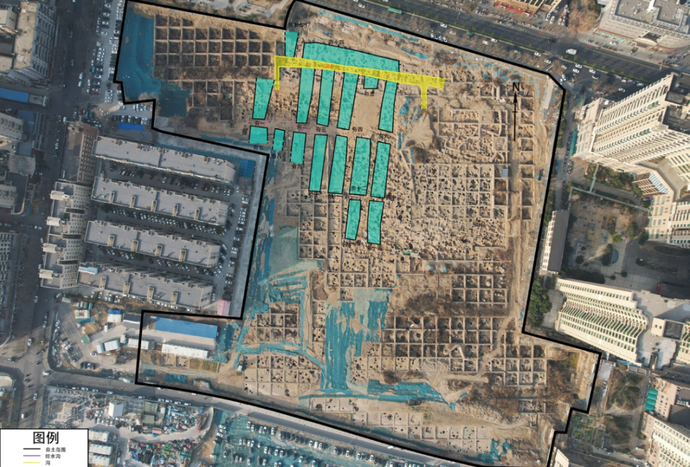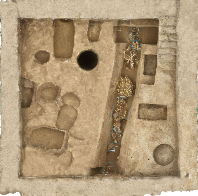 2019年,在内城西南角的夕阳楼片区项目中发现一批长方形灰坑。这批长方形坑,形制较为规整,方向多东西向或南北向,集中分布却罕见互相打破关系,体现出一定的规划性。同时,多处坑内发现较多人骨和动物的埋藏现象,伴随着完整陶器、卜骨等遗物的大量出现,初步认定该区域可能存在较为长期、固定的祭祀行为。