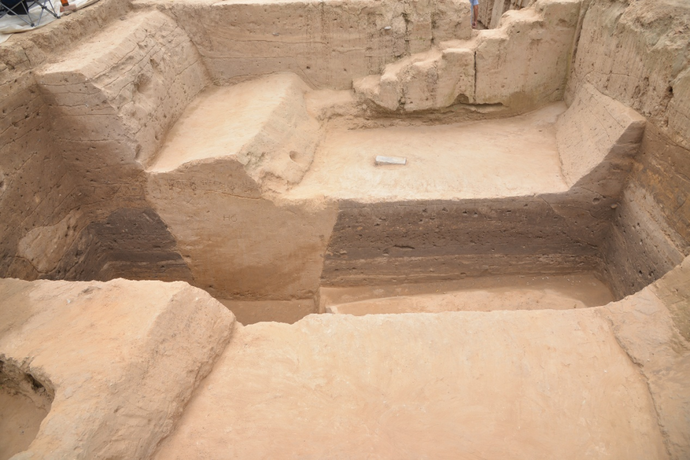 仓储设施遗存。2022年开展的书院街北片区项目发现有二里岗文化时期长条形夯土基址17处,长度在30米以上,宽度在9至11米,东西并列,南北三排,皆呈东北——西南向,与内城墙方向基本一致,并发现与之配套的3条排水沟。这与偃师商城Ⅱ、Ⅲ号建筑基址群较为相似,应是郑州商城二里岗文化时期的“府库”遗存,也是目前发现的早商时期最大的仓储设施。