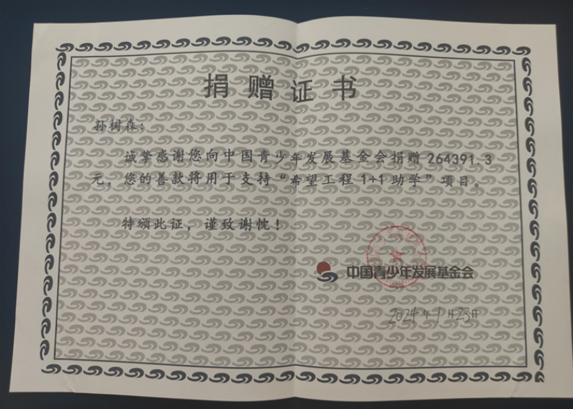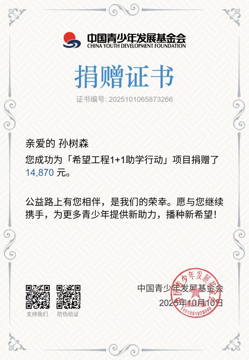 10月10日,孙树森将起诉两名造谣者获赔的14870元,捐赠给了中国青少年发展基金会。