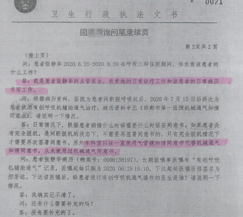 而询问笔录之中,对于老人病历资料内并没有《邯郸市第一医院机械通气知情书》这一问题,涉事医生的回答,也让孙树森十分不解。