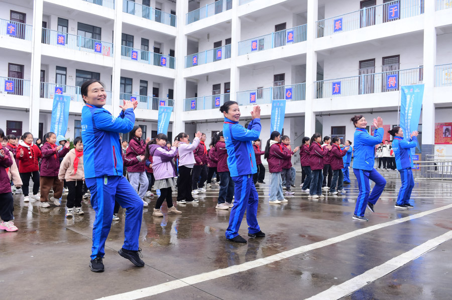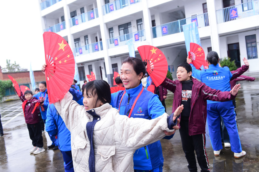 本次活动由郑州市体育局主办,以“全民健身相伴成长”为主题。活动中,郑州市优秀社会体育指导员们带领登封市南店小学的学生们学习了广播体操、广场舞、太极扇等全民健身项目。他们反复为孩子们示范基本动作,带着他们分组进行练习,手把手规范他们的工作。伴随着优美的音乐,小小校园呈现出一片欢腾热闹的景象。