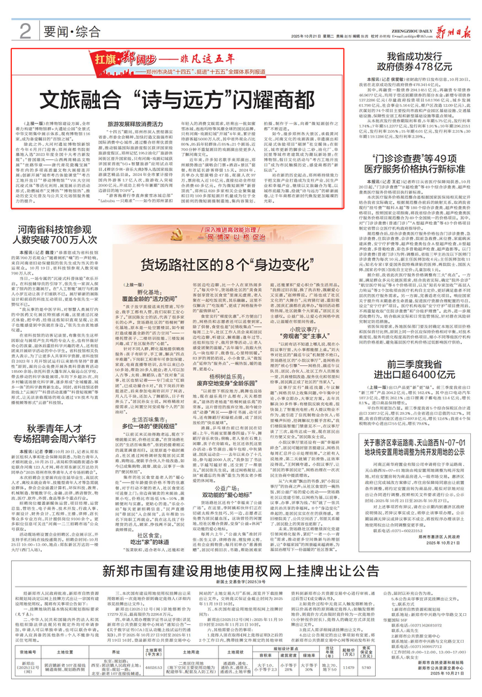 如今,漫步郑州各大景区,承载黄河文化、河南文化的戏剧表演、非遗演出和沉浸式体验项目“刷屏”社交媒体;在街区,城市更新的脚步让二砂、油化厂、阜民里等城市老建筑成为潮玩新场景;在博物馆,假日文化活动与“考古工地开放日”成为市民触摸历史,感受商都的“新玩法”。
