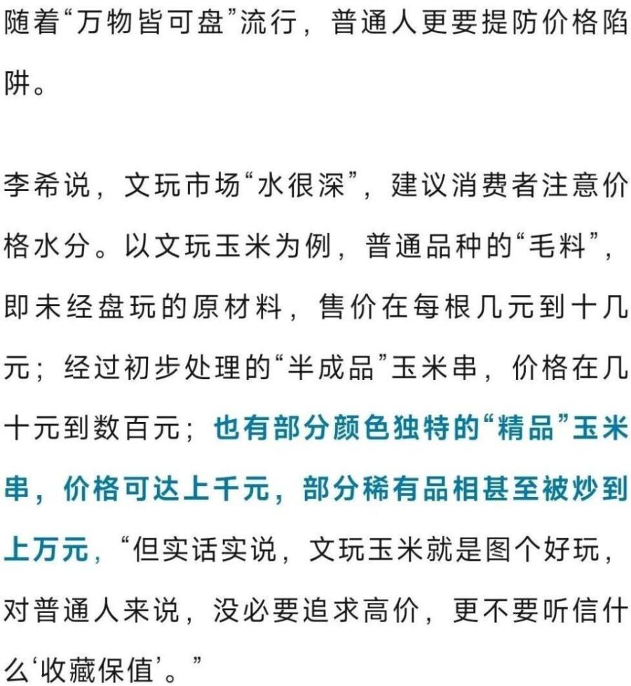 丁丁表示,文玩玉米的走红其实与当下的“万物皆可盘”有关,“很多消费者追求的不是材质昂贵,而是通过‘盘’这个动作,舒缓压力、消磨时间,得到情绪价值。