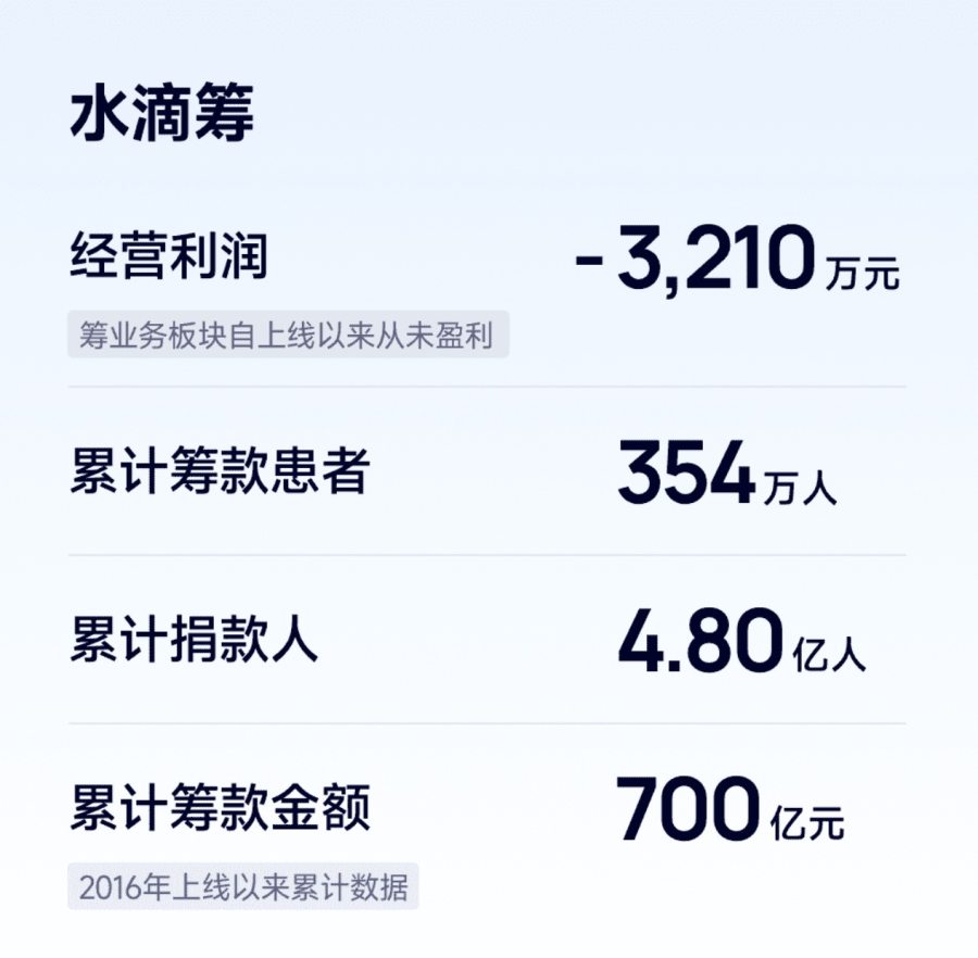 作为品牌认知的起点,水滴筹业务持续承压。2025年第二季度众筹收入同比下降2.7%,筹款金额从去年同期的13亿元降至12亿元,且仍处于亏损状态(Q2经营利润亏损3210万元)。这一表现与公众信任修复缓慢直接相关。