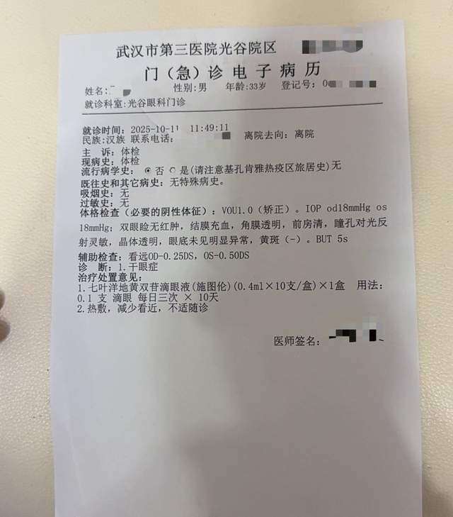 带着疑惑,他前往武汉市第三医院挂眼科号。经过散瞳验光等专业检查,结果显示:右眼近视25度,左眼近视50度,均属低度近视范围,且他的双眼调节能力较强。医生告诉他:“你本来就没有那么高的真性近视度数。随着年龄增长,人眼睛调节能力自然下降,当年的假性近视部分也随之消失。”