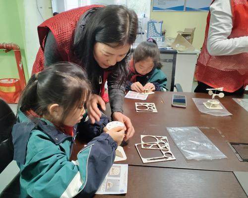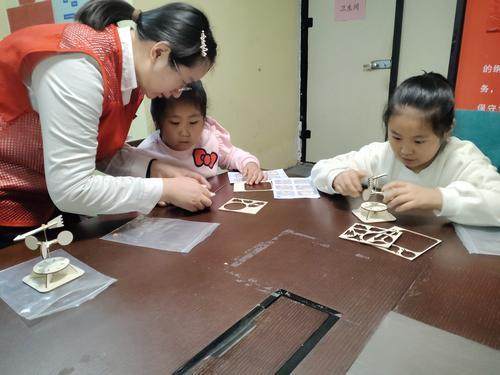 组装过程中,孩子们专注比对拼图部件,按步骤拼接、固定,遇到卡扣安装、平衡调整等难点时,志愿者及时上前指导。当一个个完整的木质风向标组装完成,孩子们迫不及待地手持作品模拟观测,观察箭头随气流转动的方向,直观掌握“北风时箭头指向北”等基础气象知识。