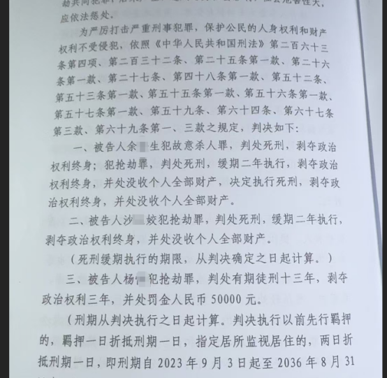 10月24日,网红“罗大美”遇害案等来一审判决,河南省南阳市中级人民法院宣判,余某生抢劫、故意杀人及沙某姣、杨某抢劫一案,以故意杀人罪、抢劫罪判处余某生死刑;以抢劫罪判处沙某姣死刑,缓期二年执行;以抢劫罪判处杨某有期徒刑十三年。