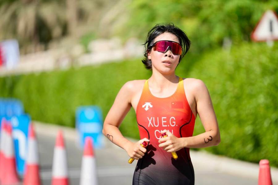 10月23日,中国选手徐恩格在铁人三项超短距离女子个人赛中。 新华社发(巴林亚青会组委会供图)