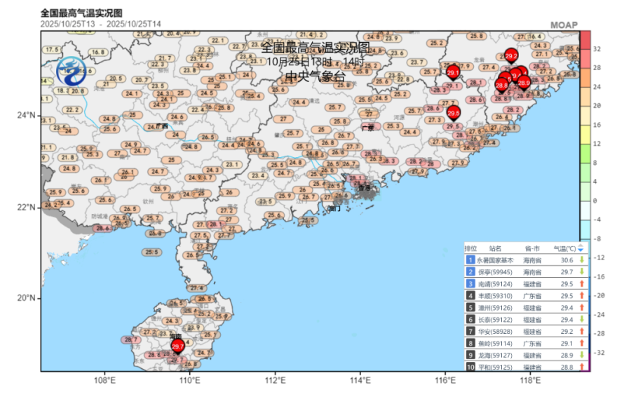 南方尤其是华南地区,今天体感暖和舒服,像广东、海南、福建等多地午后甚至还有热意,14时多地气温直冲30℃。
