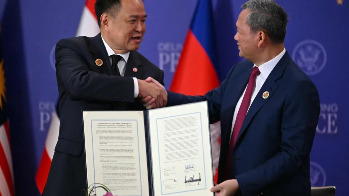 当地时间10月25日至26日,中美两国经贸团队在马来西亚吉隆坡举行中美经贸磋商。这是10月25日磋商前,中共中央政治局委员、国务院副总理何立峰与美国财政部长贝森特合影。新华社记者 白雪骐 摄