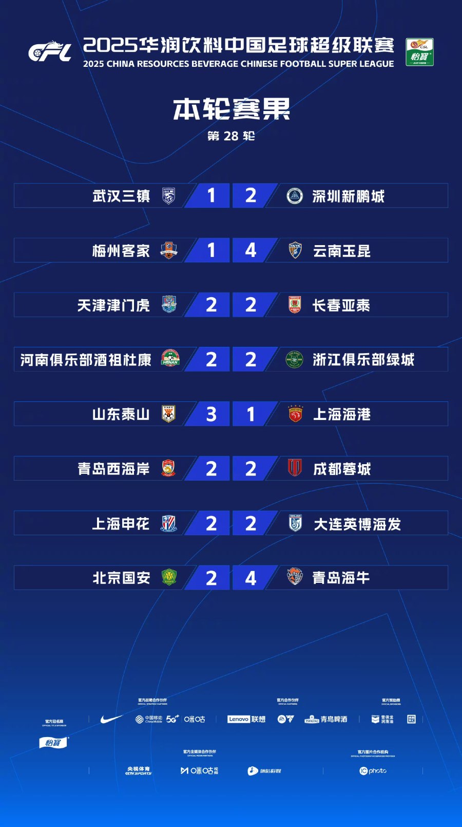 本轮领头羊上海海港做客济南挑战山东泰山,这被视为他们夺冠路上的最重要的一道坎。尽管李新翔在开场9分钟就为本队首开纪录,但随着近来状态上佳的前锋莱昂纳多因伤提前离场,上海海港攻击力大受影响,最终被对手翻盘,1∶3失利。泰山的前锋卡扎伊什维利本轮梅开二度,让自己的进球数达到了24个,进一步巩固了射手榜榜首的位置。