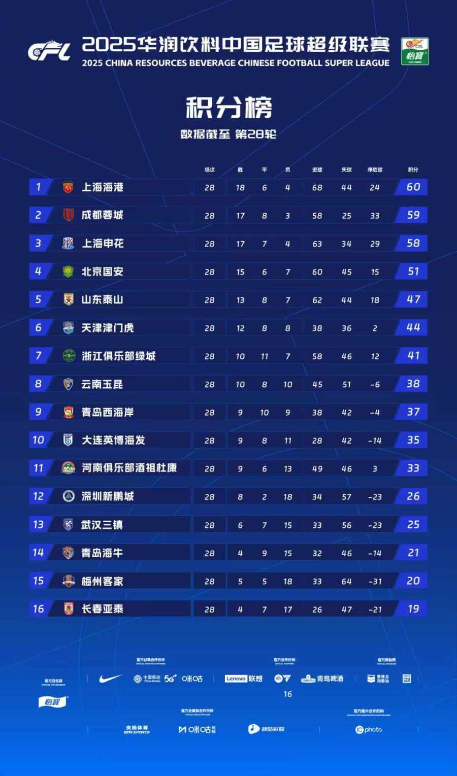 作为三场事关争冠的比赛中最早开始的一场,海港在济南受挫,让成都蓉城和上海申花的球迷都兴奋不已,因为两队都看到重回榜首的希望。然而和上海海港一样,两支队伍也都遇到了强力阻击,稍有不同的是,他们都在最后时刻顽强扳平了比分,避免了失利的尴尬。只是这种关键时刻,1分并不解渴,此前提心吊胆的上海海港球迷也由此长出了一口气。本轮过后,上海海港积60分继续排名榜首,成都蓉城和上海申花分别积分59分和58分紧随其后。领先优势虽然缩小,但夺冠主动权依然掌握在海港手中。以这样的趋势,今年的冠军一定会在最后时刻方才产生。
