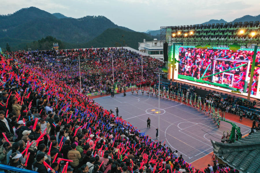 这是2024年3月22日拍摄的2024年乡村篮球球王争霸赛开幕式现场(无人机照片)。当日,以“活力四射 迎‘篮’而上”为主题的2024年乡村篮球球王争霸赛开幕式在贵州省黔东南苗族侗族自治州台江县台盘村举行。本次比赛将从3月持续到11月,是一次跨度长、范围广的全新赛事。新华社记者 杨文斌 摄