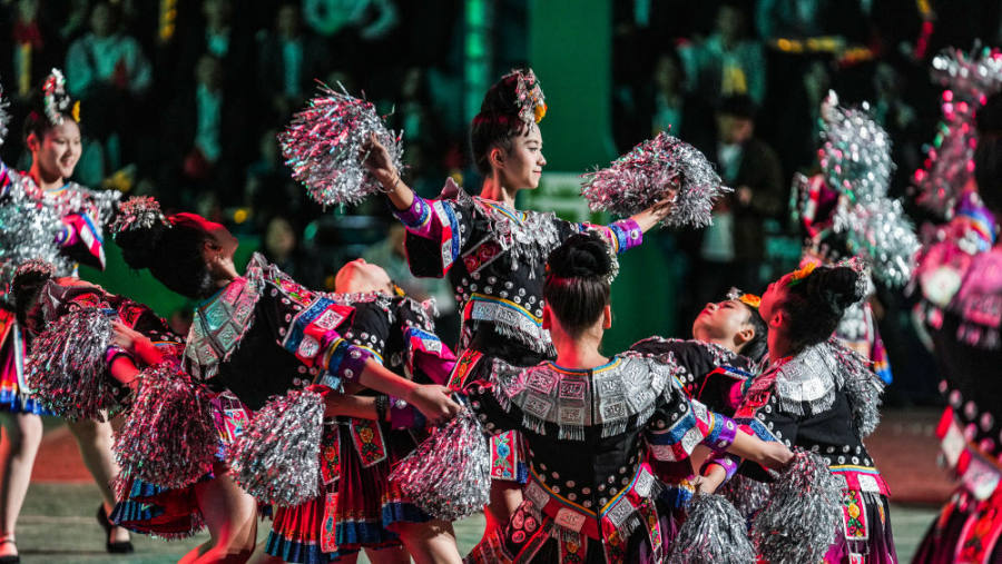 4月13日,演员在启动仪式上进行歌舞表演。当日,大地流彩·2025年全国和美乡村篮球大赛(村BA)启动仪式在贵州省黔东南苗族侗族自治州台江县台盘村举行。新华社记者 陶亮 摄