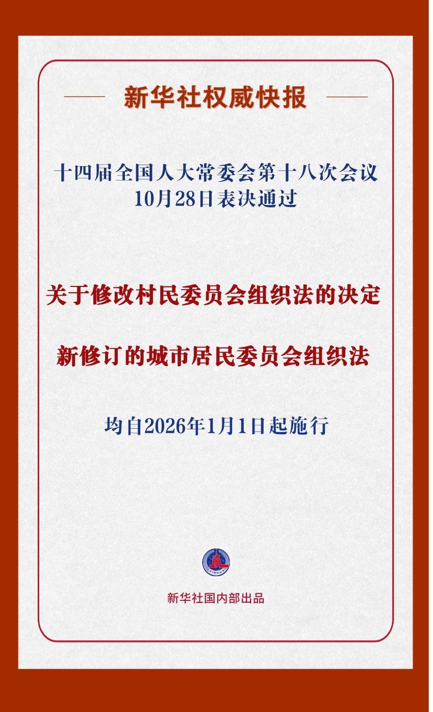 10月28日,十四届全国人大常委会第十八次会议分别表决通过关于修改村民委员会组织法的决定和新修订的城市居民委员会组织法,均自2026年1月1日起施行。